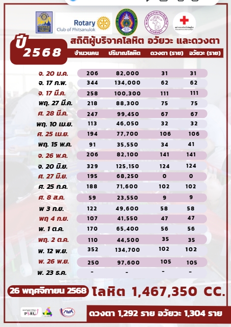 เมื่อวันที่ 26 พฤศจิกายน 2568 กองพัฒนานักศึกษา มหาวิทยาลัยราชภัฏพิบูลสงคราม รายงานผลความสำเร็จของโครงการบริจาคโลหิตเพื่อสังคม ซึ่งสามารถระดมโลหิตได้มากกว่าเป้าหมายที่ตั้งไว้ทะลุ 1,400,000 ซีซี โดยมียอดสะสมล่าสุดอยู่ที่ 1,467,350 ซีซี พร้อมทั้งมีผู้แสดงความจำนงบริจาคอวัยวะ 1,304 ราย และบริจาคดวงตา 1,292 ราย