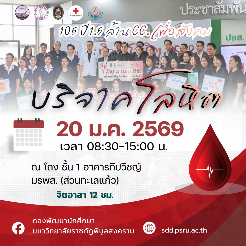 “5 ปี 105 ล้านซีซี แห่งการแบ่งปัน ต่อลมหายใจเพื่อนมนุษย์” โครงการบริจาคโลหิตของเราเติบโตขึ้นด้วยพลังแห่งการให้จากทุกท่าน ในปี 2569 นี้ ถือเป็นวาระพิเศษครบรอบ ปีที่ 5 ที่เรายังคงมุ่งมั่นเป็นสะพานบุญ เชื่อมต่อโลหิตทุกยูนิตส่งตรงไปยังศูนย์บริการโลหิตสภากาชาดไทย เพื่อช่วยเหลือผู้ป่วย มหาวิทยาลัยราชภัฏพิบูลสงคราม ขอเชิญชวนบุคลากร นักศึกษา และประชาชนทั่วไป ร่วมเป็นส่วนหนึ่งของพลังแห่งการให้ใน โครงการบริจาคโลหิต ประจำปี พ.ศ. 2569 ซึ่งถือเป็นการจัดกิจกรรมต่อเนื่องเป็น ปีที่ 5 เพื่อสำรองโลหิตให้กับภาคบริการโลหิตแห่งชาติที่ 9 จังหวัดพิษณุโลก และโรงพยาบาลในเครือข่าย