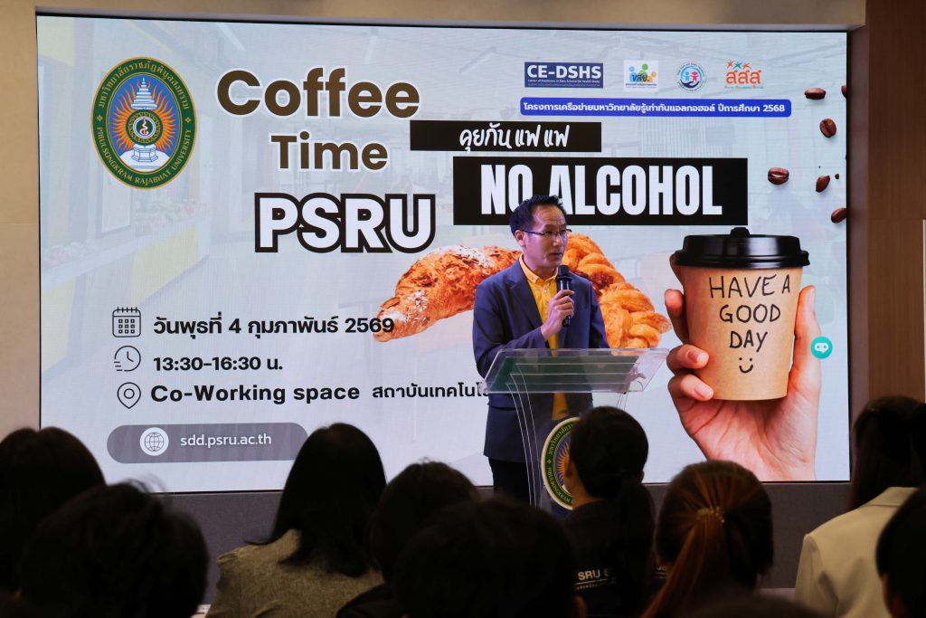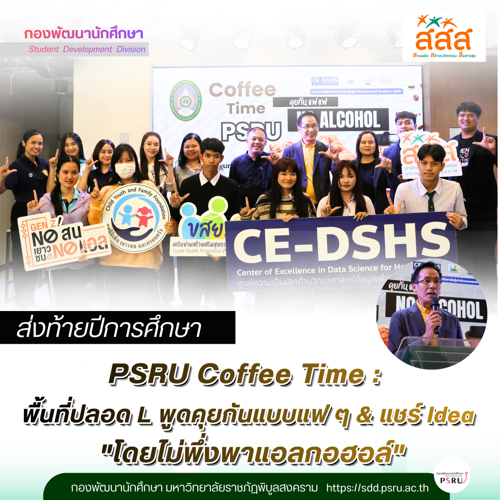 วันที่ 4 กุมภาพันธ์ 2569 เวลา 13.30 น. กองพัฒนานักศึกษา มหาวิทยาลัยราชภัฏพิบูลสงคราม จัดกิจกรรม “PSRU Coffee Time : พื้นที่ปลอด L พูดคุยกันแบบแฟ ๆ & แชร์ Idea” เพื่อสรุปผลการดำเนินงานด้านการสร้างเสริมสุขภาวะนักศึกษา ประจำปีการศึกษา 2568 ณ ลานกิจกรรม Co-Working Space สถาบันเทคโนโลยีดิจิทัล
