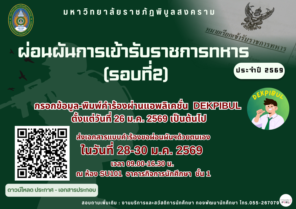 เนื่องจากมีนักศึกษาแจ้งความประสงค์ให้มหาวิทยาลัยผ่อนผันการเข้ารับราชการทหาร ประจำปี พ.ศ.๒๕๖๙ เพิ่มเติม มหาวิทยาลัยจึงประกาศรับสมัครให้นักศึกษาชายที่กำลังศึกษา ณ มหาวิทยาลัยราชภัฏพิบูลสงคราม ประจำปีการศึกษา ๒๕๖๘ ดำเนินการตามวิธีการรับสมัคร ดังต่อไปนี้